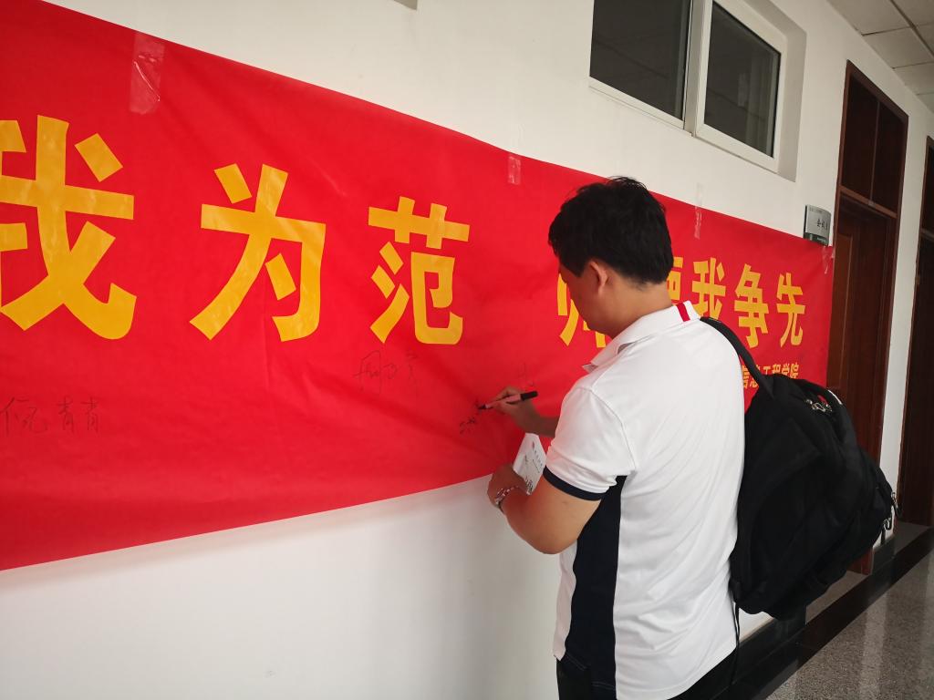 身正为范,师德争先。6月1日上午,信息工程公司老师们纷纷在横幅上签上自己的名字,写下自己的承诺。新进公司的青年教职工还举行了 “身正我为范,师德我争先”宣誓承诺活动,教师们手捧《师德手册》,齐声宣读《入职誓词》,立志以德立身、以德立学、以德施教,争做四有好老师。阵阵激昂的誓词回荡在整个德业楼,直击心灵。
