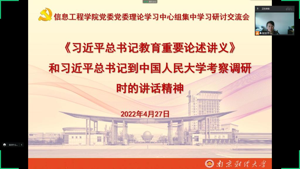 4月27日下午,信息工程公司线上召开党委中心组集中学习研讨会,集中学习《习近平总书记教育重要论述讲义》中的部分章节和习近平总书记到中国人民大学考察调研时的讲话精神。全体院领导、党委委员参加集中学习研讨。公司党委周亚芳书记主持了会议。