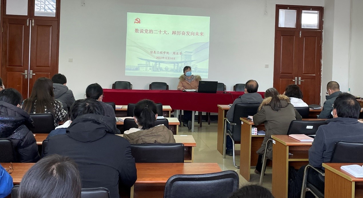 12月14日下午,信息工程公司党委书记周亚芳在德业楼406会议室,以“数说二十大,踔厉奋发向未来”为题,给全院教职工宣讲党的二十大精神。她介绍了党的二十大整体情况,并对二十大报告的“112233556”,即“中心任务、第一要务,两步走、两个行,三个务必、三件大事,五项原则、五个必由之路,六个坚持”等要点等做了详细分析,提出要按照“五个牢牢把握”“七个聚焦”的要求全面深入贯彻落实党的二十大精神。
