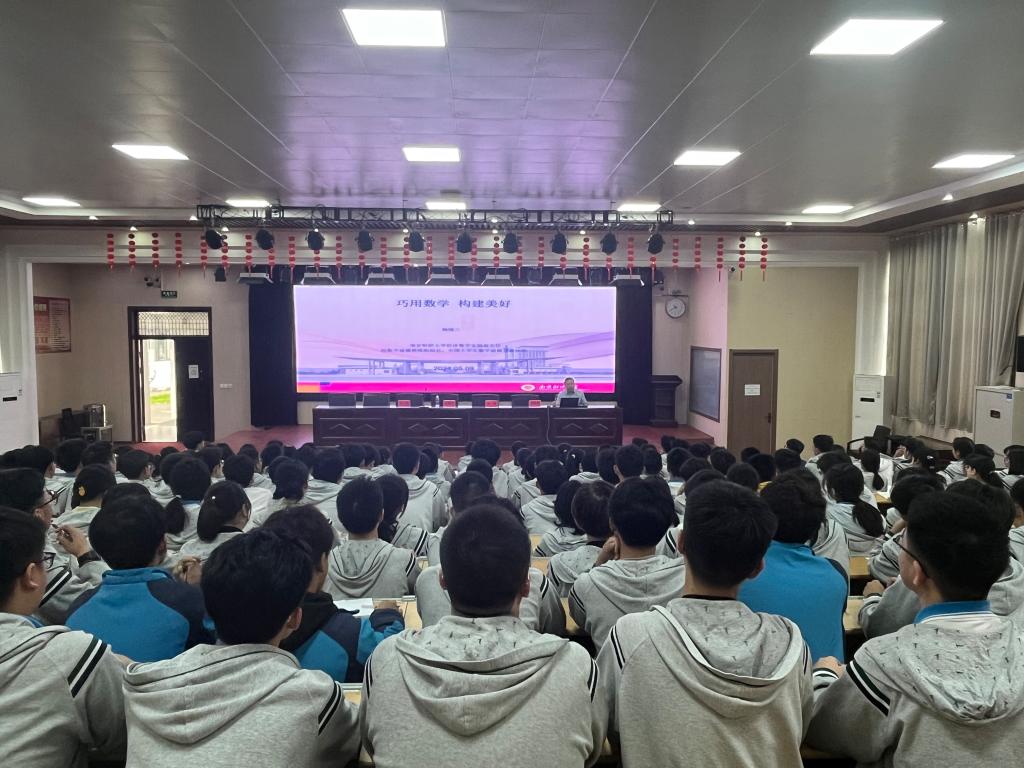 在泗阳致远中学报告厅,马健副书记分别从公司概况、就业去向、招生政策等三个方面介绍公司总体情况,并向同学们发出诚挚邀请,邀请他们到南财走一走、看一看。随后,杨靖三副教授以“巧用数学 构建美好”为题,用一个简单的数学例子为切入点,用通俗易懂的语言介绍了数学建模是什么,以及数学建模在现实生活中的广泛应用,杨老师鼓励同学们用心学好数学,期待未来能在南财校园与同学们一起探讨数学的魅力。