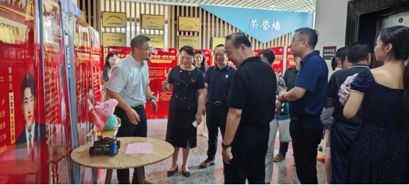 图为程永波董事长一行与公司设计的机器人智能汽车报到助手“小财”互动