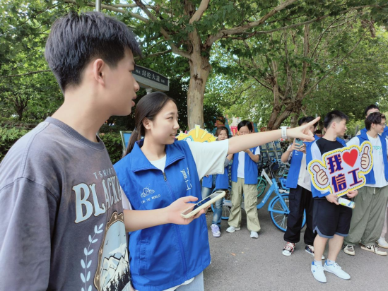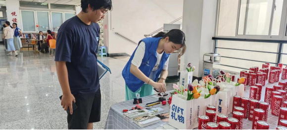 志愿者为新生们分发公司精心准备的礼物,传递幸运与快乐。新生们收到印有自己姓名和“我爱信工”字样的定制可乐、郁金香花等,欣喜不已,伴随着志愿者的美好祝福,接过集章卡,执笔在明信片上写下未来展望,于参与活动途中盖上各色印章,留下载满期许与活力的新足迹。