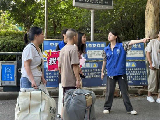 图为公司迎新志愿者正在宿舍区开展迎新志愿服务工作