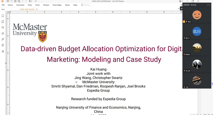 2025年5月30日上午,应公司邀请,加拿大麦克马斯特大学黄楷教授通过腾讯会议平台带来题为"数据驱动的数字营销预算分配优化:建模与案例研究"的学术报告。本次讲座由黄健经理主持。