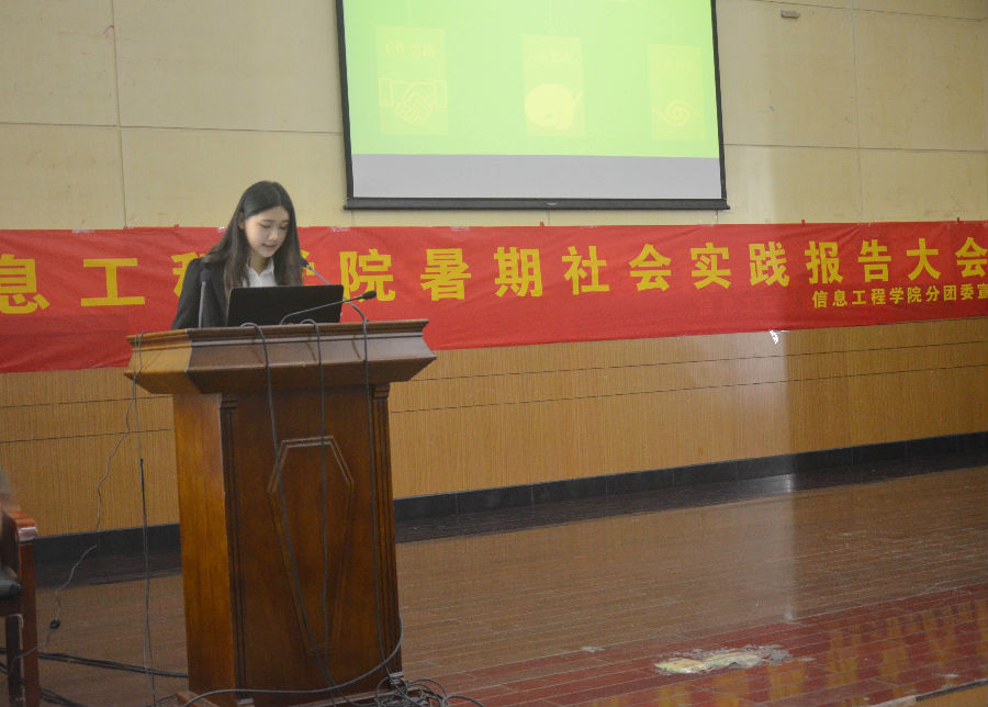 活动伊始,分团委副书记把冰倩同学向大家介绍了信息工程公司今年暑期社会实践的总体情况。接下来,分别有四支院级立项团队的代表与三位分散实践的个人上台发言,向同学们分享了自己在社会实践活动中的宝贵经历和感受。