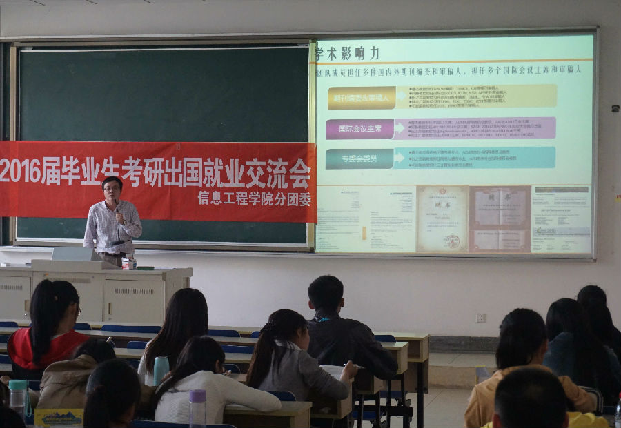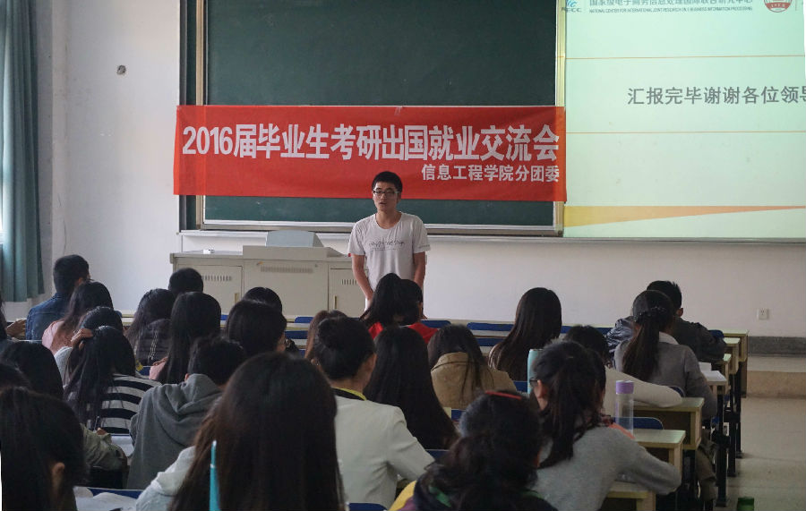 10月14日下午,信息工程公司在仙林校区理工学科楼101教室举办2016届毕业生考研出国就业交流会,信息工程公司硕士生导师伍之昂博士、辅导员张玉蓉、孙脉等老师以及2016届毕业生参加了此次大会。