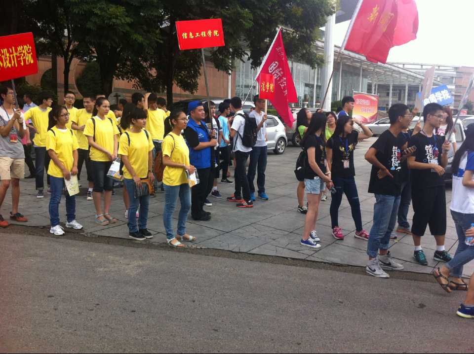 2015年9月5日早上6点半,天微微亮,在经过前期认真筹备与周密部署后,信息工程公司迎新工作顺利开展。在公司报到处、老员工活动中心、宿管站等地,公司志愿者身着统一的蓝色马夹,佩戴蓝色帽子,举着院系指示牌,指引新生报到,帮忙拎行李,回答新生和家长的各种咨询。