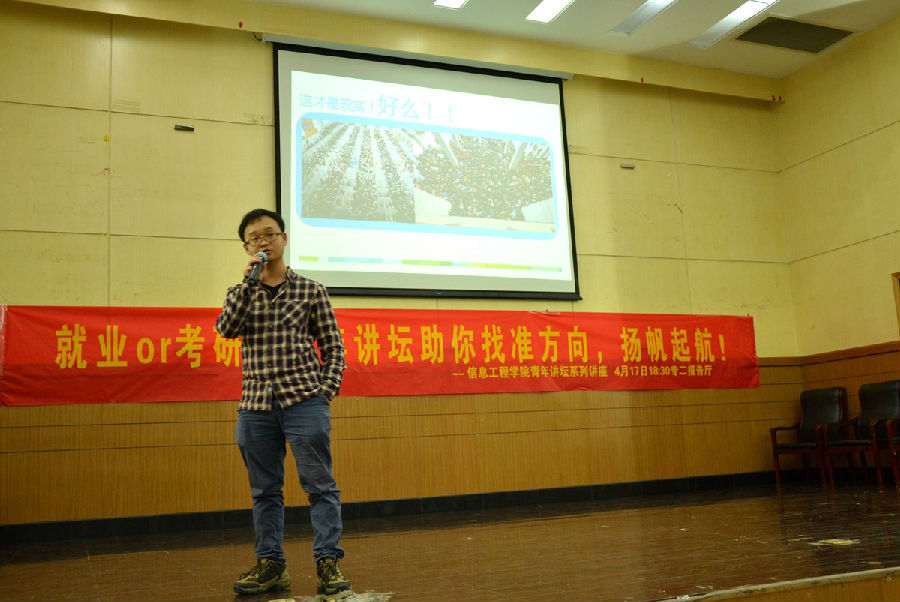 本次青年讲坛邀请到了就职于吾曰思程的公司毕业生严翔学长、考取南大计算机专业研究生的马健学长、胡友来学长、考取南大情报学专业的周美汐学姐、考取东南大学计算机专业研究生的周华杨学长及考取南理工计算机专业研究生的黄海学长来进行经验分享。