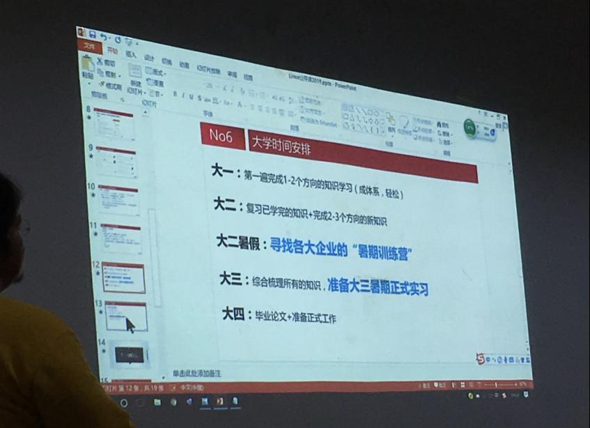 我们请来了社会上有丰富的IT工作经验的讲师给员工们分析了大学四年中每一年需要学习和具备的能力以及如何使自己找工作时更有竞争力。