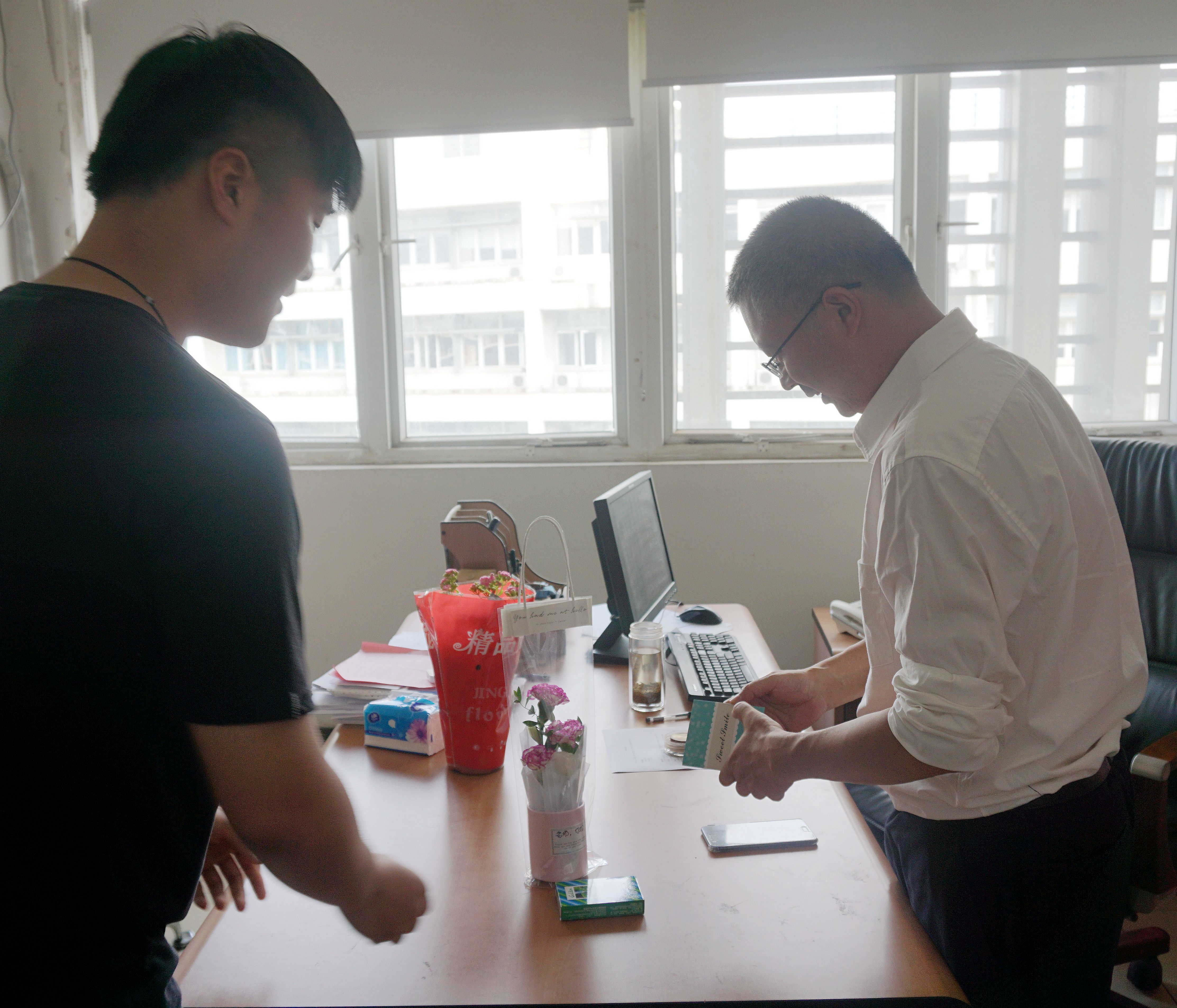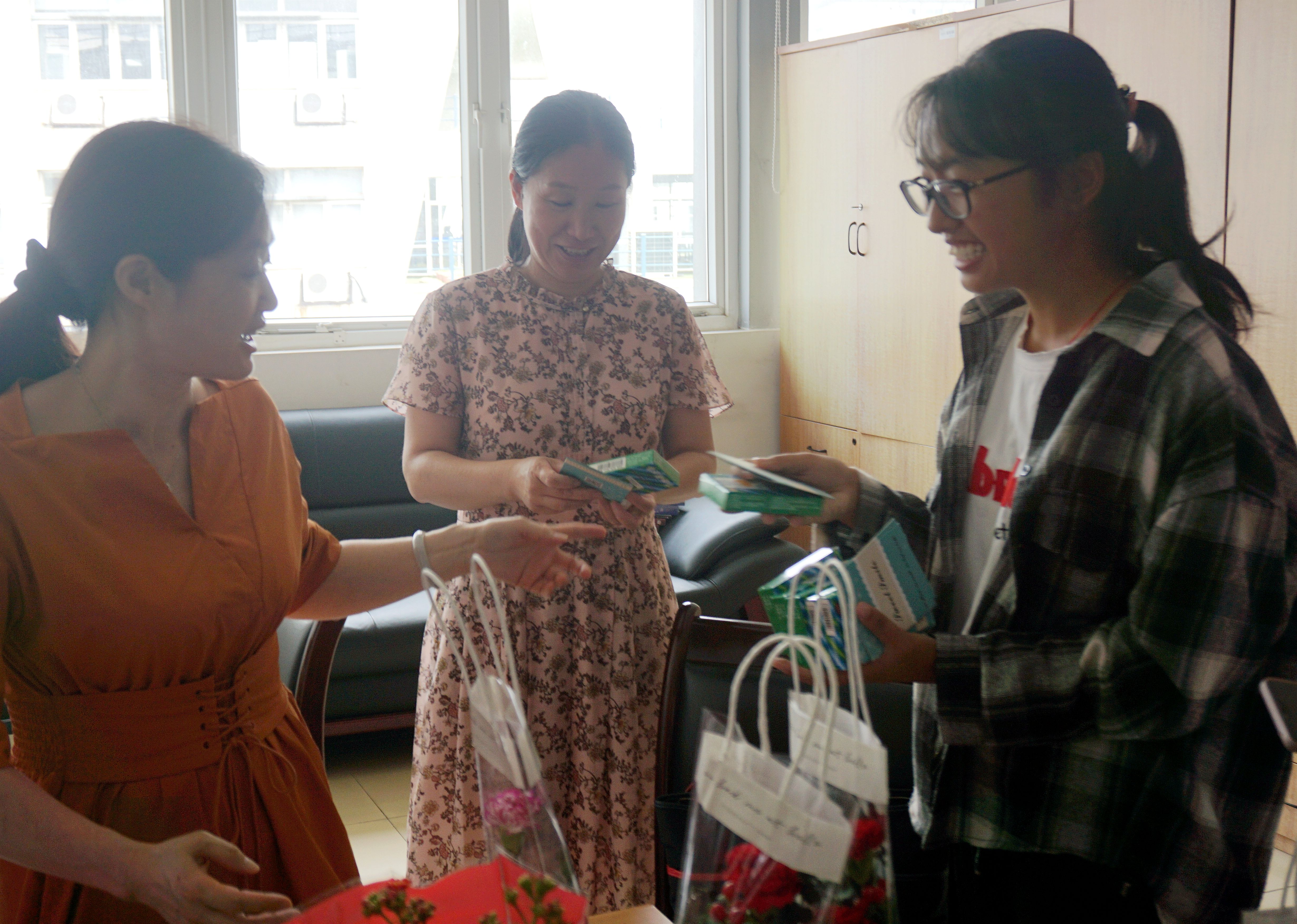 随后我们将花和润喉片以及手写的贺卡依次送给了公司领导、教授和老师们,并向他们送上我们诚挚的祝福。老师们很开心收到我们的祝福,也对员工会全体成员表示感谢。