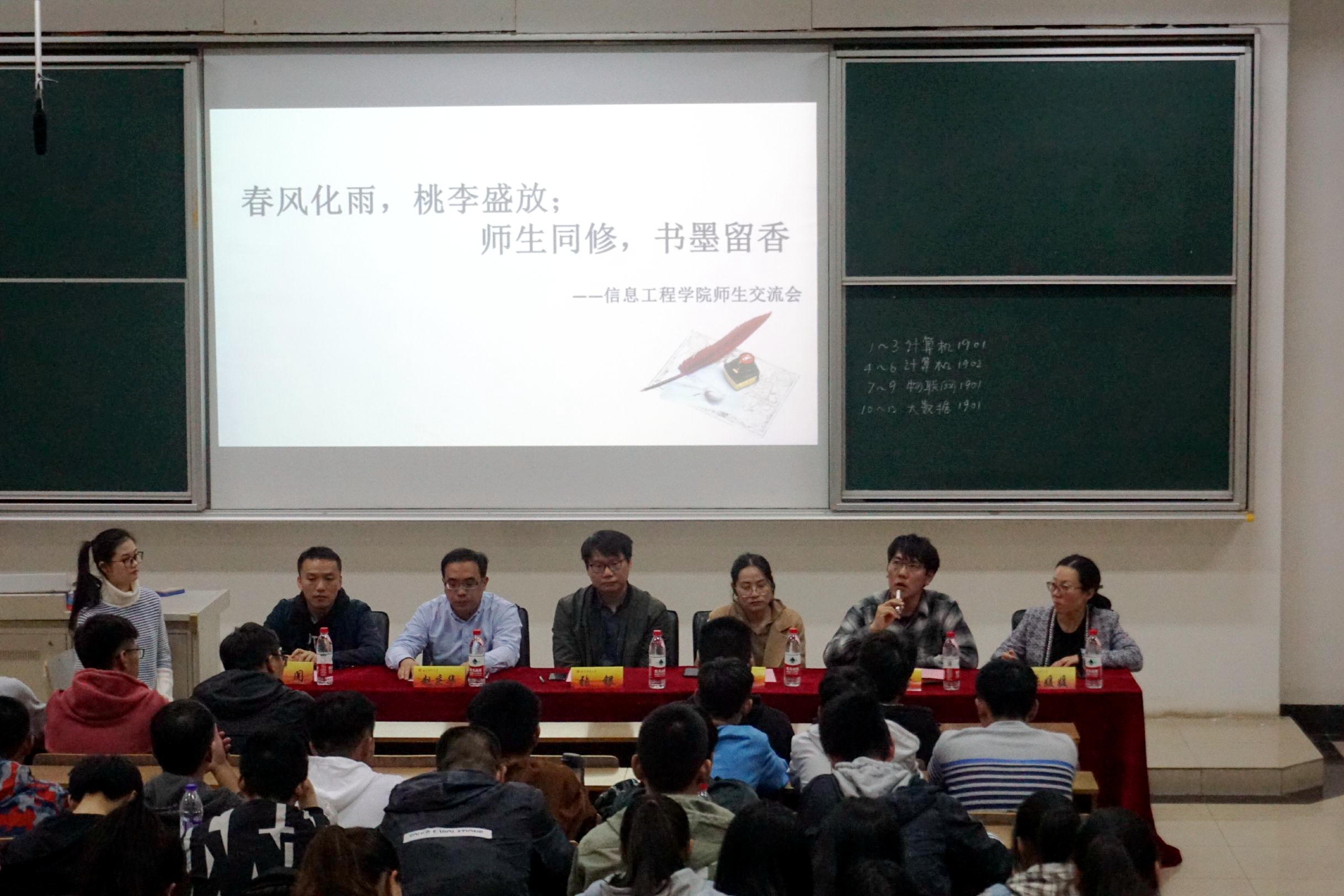11月11日晚,信息工程公司“春风化雨,桃李盛放;师生同修,书墨留香”师生交流会在仙林校区博观楼JB302举办。信息工程公司2019级新生班主任佟德宇、赵庆华、张银、蒋婷四位老师参加活动,与2019级新生们进行交流。同时,公司分团委书记、学工办主任张媛媛老师和2019级新生辅导员张闻老师也出席了这次活动,共同来为大一新生指明未来的方向。