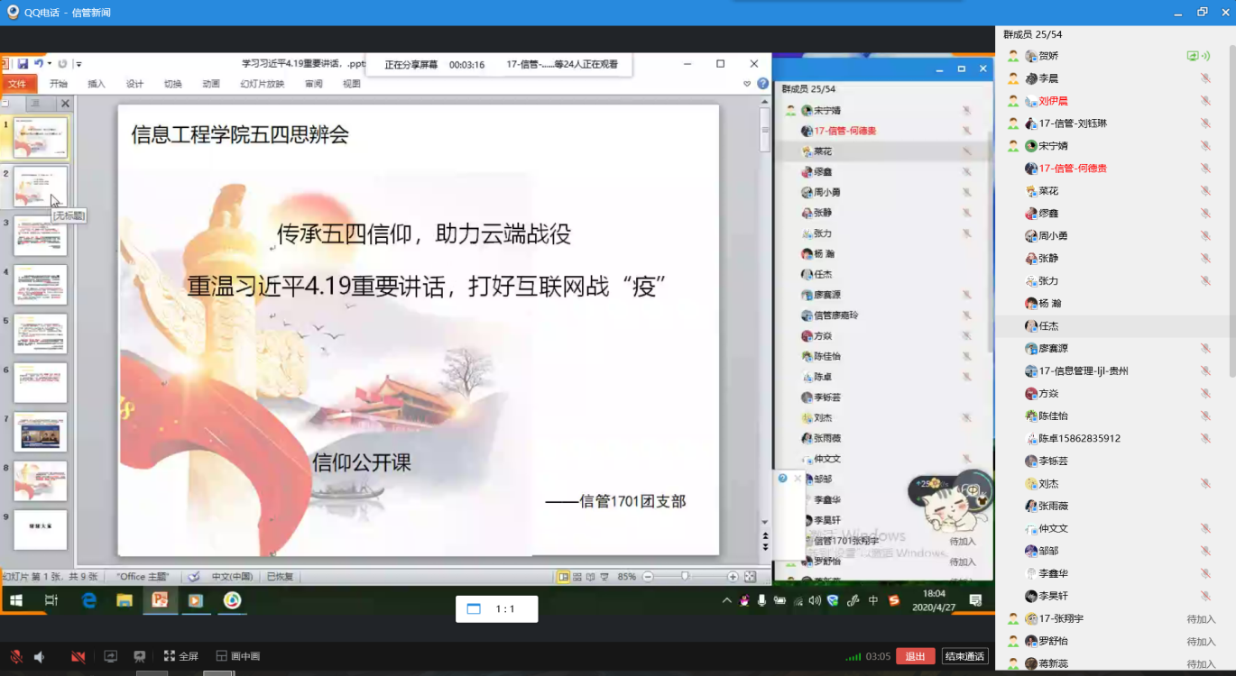 五四前夕,为信息工程公司分团委在校团委的指导下,在全院团员青年中组织开展“让青春为祖国绽放”网上主题团日活动,公司大一、大二、大三、研究生团支部共有员工718名,参与团课人数为703名,参与率为97.9%。各团支部在组织员工观看后都撰写了新闻稿作为本次学习网上主题团课的总结,在学习过程中同学们纷纷发送弹幕“五四精神,传承有我”。通过本次网上团课的学习,同学们意识到五四运动以来,一代又一代的先进青年走在时代前列,在实现中华民族伟大复兴的旗帜下,凝聚起了砥砺迸发、艰苦奋斗的精神力量。广大的青年团员更应创造自己的独特价值,实现青年自身的进步。