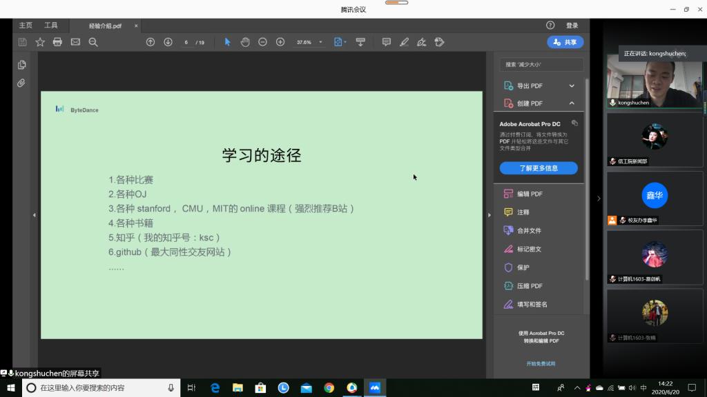 首先带来分享的是公司2012级的孔舒晨学长。孔舒晨2016年从公司毕业,硕士研究生就读于华东师范大学,硕士期间发表CCF、SCI论文多篇,现任字节跳动推荐算法工程师。他主要分享了考研和读研经历。他建议同学们本科期间主动学习专业知识,多利用网络资源。考研方面数学要多刷题,重视上机考试,谨慎选择导师。最后,孔舒晨学长建议大家本科期间多参加一些有含金量的竞赛,并把结果整理好以完善自己的简历。