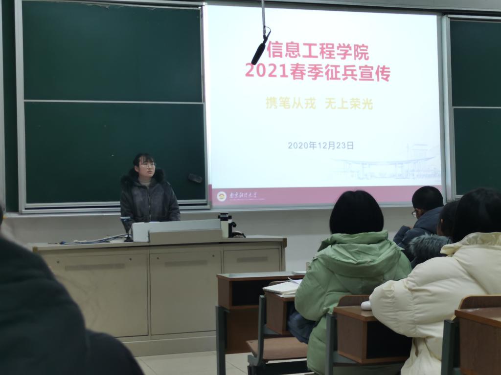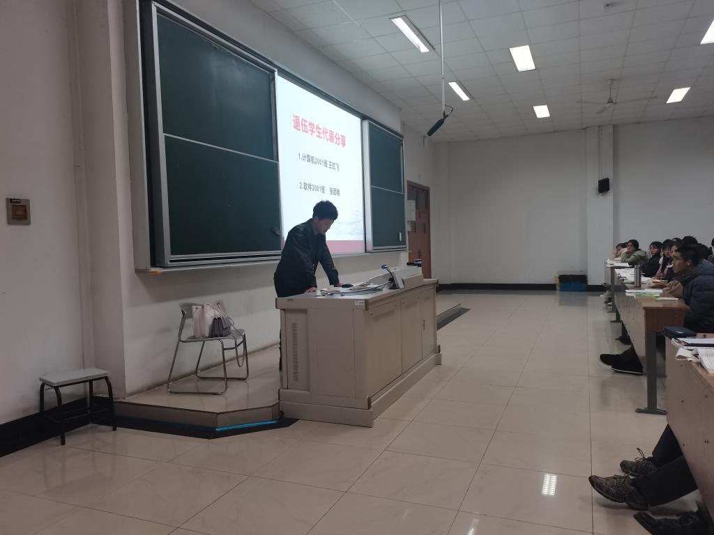 为鼓励老员工积极参与应征入伍,12月23日晚,公司在JB301开展了2021春季老员工征兵宣讲,宣讲会由辅导员刘芳老师主持,20级全体同学参加。