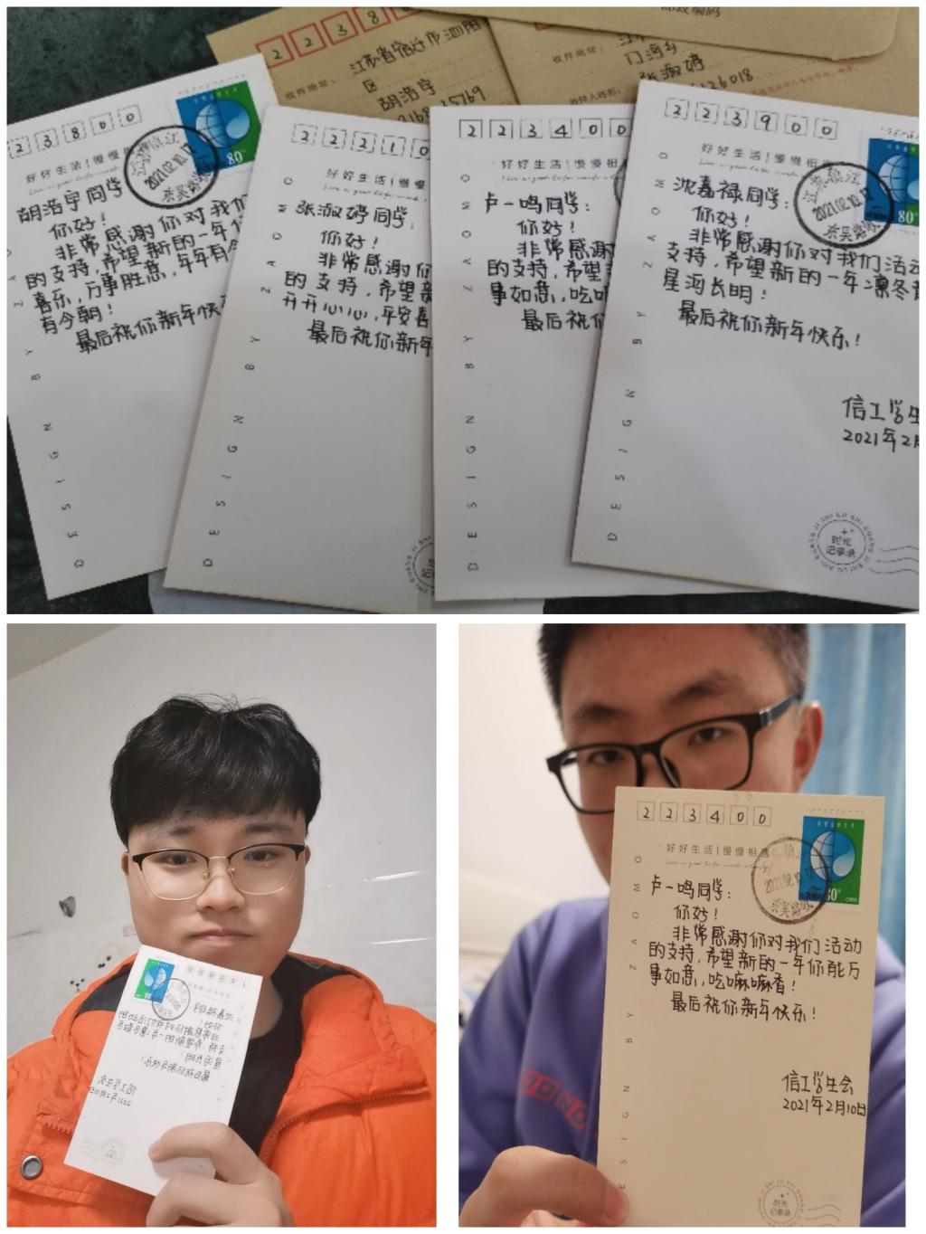 新春佳节除了年味,更少不了中国人为彼此送上对崭新一年的美好祝愿。随着信息化的发展,人们的拜年方式越来越现代化、网络化,从前车马很慢,书信很远,过年只等明信片,现在邮寄新春明信片,让同学们感受从前人们收到来自远方的明信片的欣喜感,感受别样的新年祝福。在“邮差年味”的活动中,大家纷纷展示了自己对新年的祝福与期待,整个活动祝福满满。来自五湖四海的同学们,将自己对新一年的憧憬通过邮差小哥的手传递给下一个人。小小的明信片上寄托了大大的祝福。员工们收到寄出的明信片后十分的惊喜,感受到蕴含于小小明信片中浓浓的情意,也度过了一个愉快的春节。沈同学:“这次邮差年味的活动中收到贺卡让我很欣喜,即使放假了,还能感受到公司在身边的感觉,同学们身远心近。通过我自己线上参加活动,既能够放假在家做一些有意义的事情,还可以收到来自员工会的新春贺卡。这个贺卡是对自己的肯定,同时也是鼓舞,让我知道了自己分享的事情是有被关注到,自己参加的活动有被重视。希望员工会部长们多提供参与活动的机会,即使放假也能做一下有意义的活动,也能得到肯定的评价。”卢同学:“哇!我新年在家居然还能收到员工会的贺卡,惊喜!员工会的风采,像搏击长空的雄鹰展翅翱翔。回眸过去,历经沧桑,奋发图强;展望未来,前途似锦,英姿飒爽。新年之际,万家团圆,愿员工会越来越好。也祝所有同学们在新的一年元气满满,灾祸退散。”