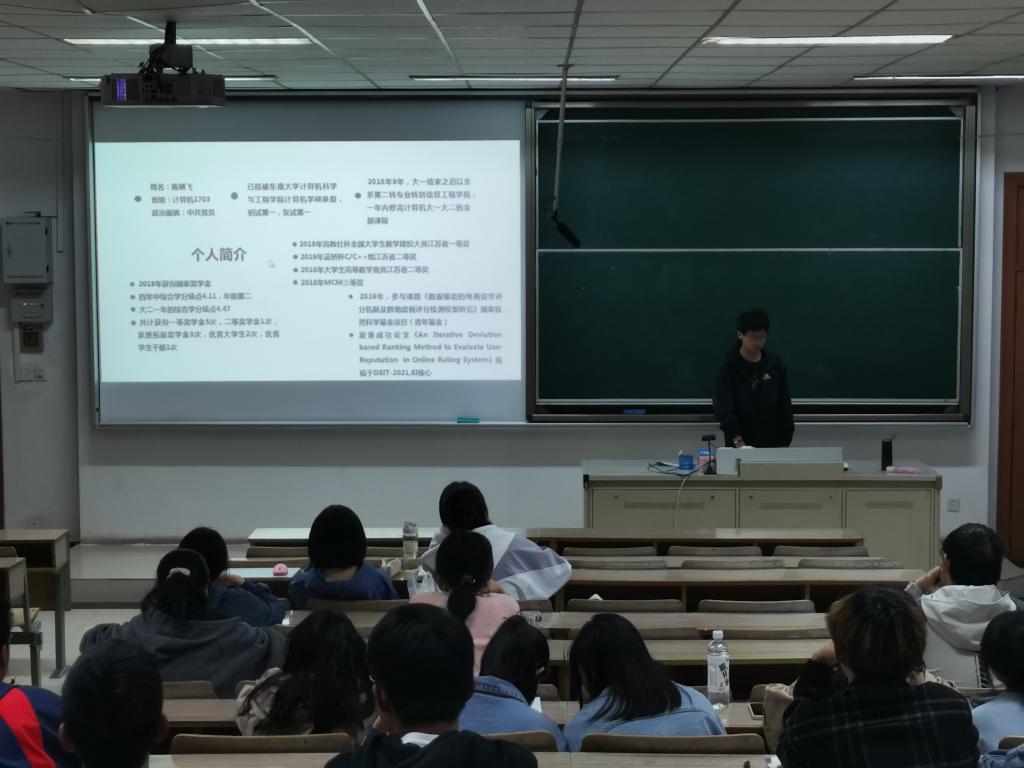 活动伊始,陈骁飞学长向在座同学做了个性的自我介绍,“江苏省优秀老员工,考研成绩优异,以初试复试第一的好成绩上岸东南大学计算机软件学硕专业……”他把此次分享会分成五个部分:毕业去向,本科课程与绩点,竞赛,科研,考研。毕业去向的选择问题上,他指出主要矛盾在于城市的选择及未来发展的确定;他还介绍了各种含金量较高,有参与感的大学竞赛,包括算法类比赛,数学建模大赛;其中他着重强调了科研的重要性,就他自身参与的科研项目来说,重在脚踏实地与创新;考研的成功等于正确的方法、不懈的努力、良好的心态以及恰当的复习材料,同时,陈骁飞还分享了面试时的交谈技巧,注意引导话题,向自己有利的方向,凸显自己的优势与才能,为面试加分。在大学期间积极他跟随老师做科研项目,数次发表论文,踊跃参加比赛,多次获得大赛奖项,也正是陈骁飞学长优异的学习成绩,突出的表现成功让他获得导师的青睐。活动最后,大一同学们踊跃地提出咨询,各抒己见,而陈骁飞学长也为他们悉心解惑,一扫胸中块垒。
