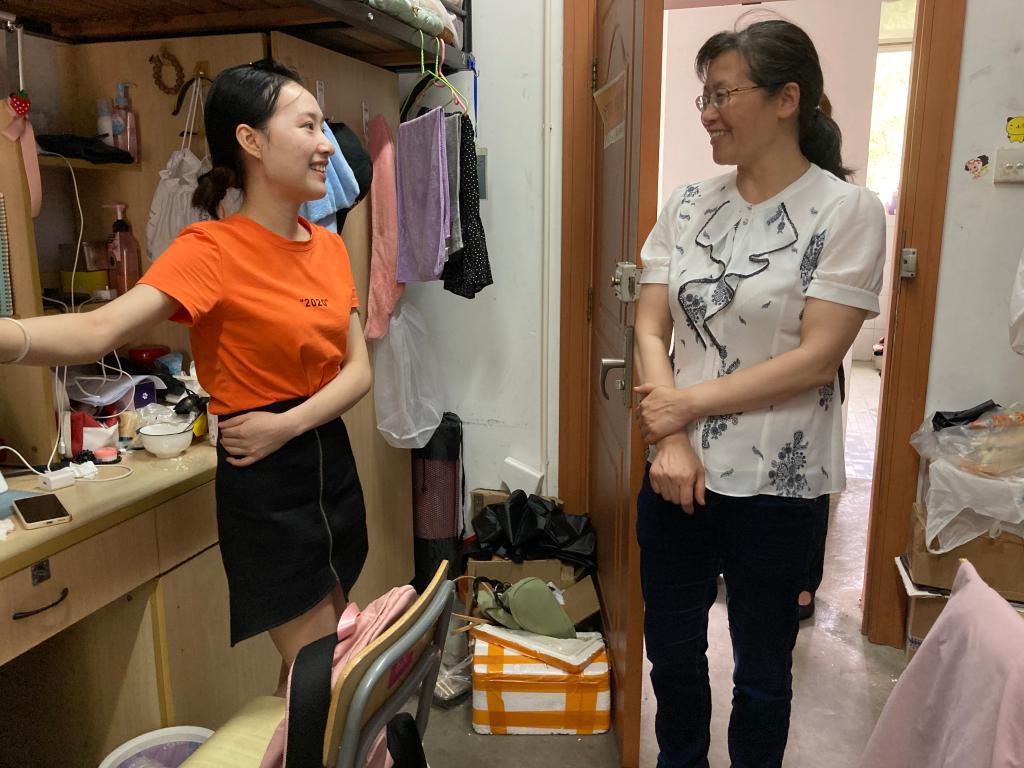 途中,学子们看到老师们都表示出欣喜与热情,积极地向老师们问好并主动上前交流。观察到员工们搬行李不易,周亚芳书记提出可以通过跳蚤市场将物品转给有需要的学弟学妹,以此来减轻离校搬运行李的压力。同时,在员工宿舍中,周书记悉心问询了学子们毕业后的去向与打算,并与实际情况进行考虑,提出了自己的建议,同辅导员一起和同学对就业想法进行了交流,得到了热情的反馈,并达成了共识。随后,老师们还看望了其他年级的学子,对他们的生活环境作了认真的考察,深入了解他们生活宿舍的整洁度与硬件设施。并对他们的考研事项、日常学习进行了关心。