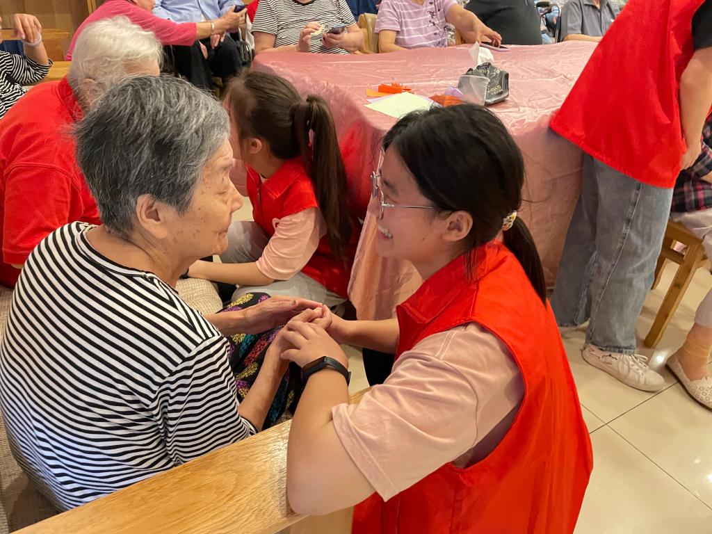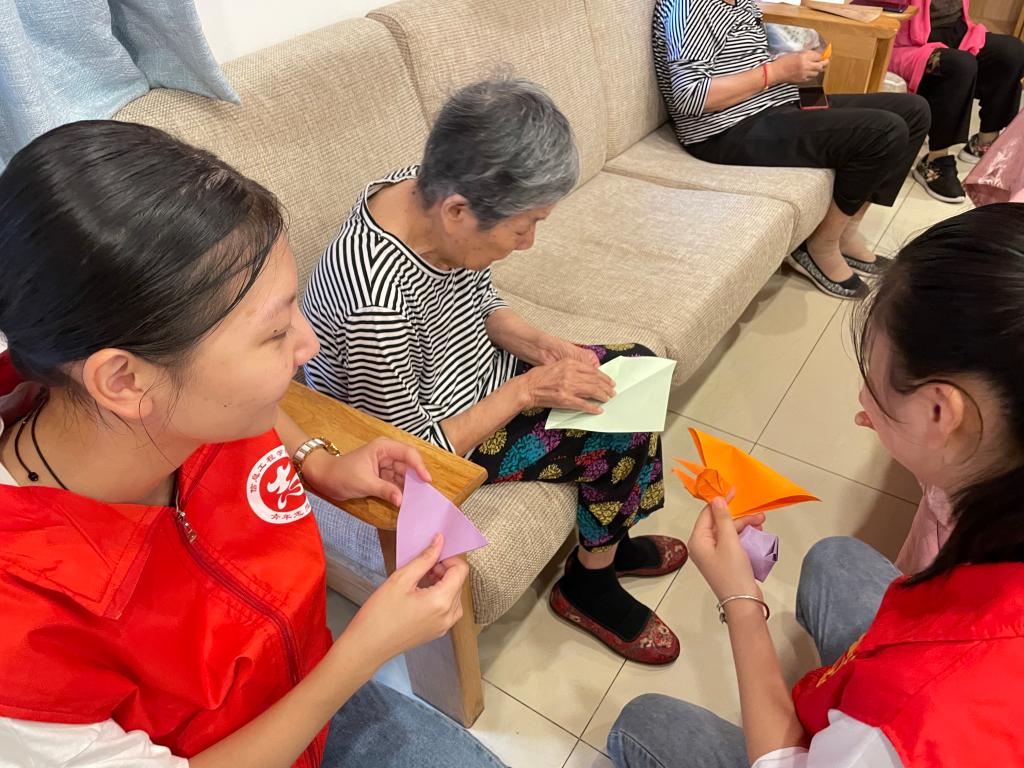 折纸庆生欢乐多。值建党一百周年纪念日,又刚为祖国母亲过完第72个生日,志愿者们准备和颐养院的老人们通过一同折纸为伟大的祖国和共产党献礼。一张张彩纸在志愿者们手把手教学下,变成了千纸鹤、爱心、雄鸡、火箭……有的老人学得很快,折好了之后还举起来开心地与志愿者分享;有的老人害怕自己会忘记,认真折了好几遍:“这样就忘不了啦!”折纸环节温暖而又祥和,在中国共产党领导下,祖国日益强大,这些看似简单实则与祖国日益强大形象相关的折纸,无一不蕴藏着这一群老幼对祖国的热爱。