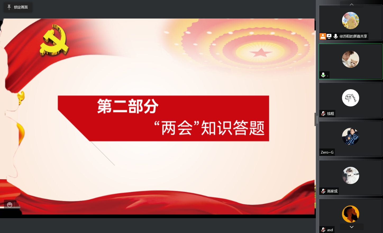 活动中,2021级王贇同学领学了乡村驶向致富道路的公益“慢火车”的相关内容,以及教育发展和民生就业相关提案;同学们也通过线上答题的方式,深入学习了两会关于教育与就业发展相关精神。
