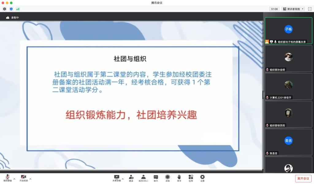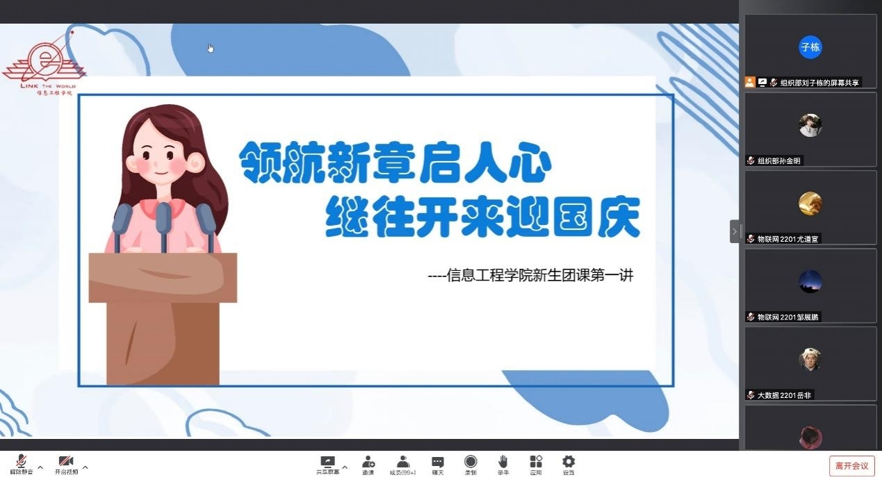 为帮助2022级新生更好地认识、融入大学,适应大学的新生活,培养新生积极向上、拼搏奋斗的精神,9月29日晚,信息工程公司分团委在线举办了“领航新章启人心,继往开来迎国庆”——新生团课第一讲,2022级全体同学参加。