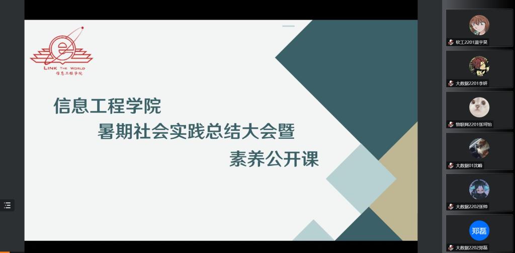 为进一步深化和巩固实践成效,推进公司暑期社会实践持续深入开展,10月21日晚,信息工程公司在线召开了2022年暑期社会实践总结分享会暨素养公开课,从前期动员、专项培训开展、中期进程管理和实践成果反馈等方面总结回顾了公司暑期社会实践成效。2020级、2021级和2022级同学参加会议。