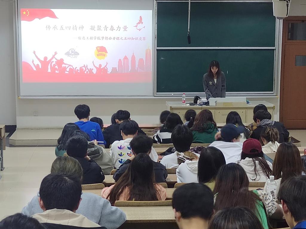 在五四青年节到来之际,为弘扬五四精神,铭记五四运动历史,激励同学们怀揣家国情怀,孜孜求学,担负起实现中华民族伟大复兴的历史重任,4月27日晚,信息工程公司在博远楼110教室举办了“传承五四精神,凝聚青春力量”梦想公开课暨五四知识竞赛。