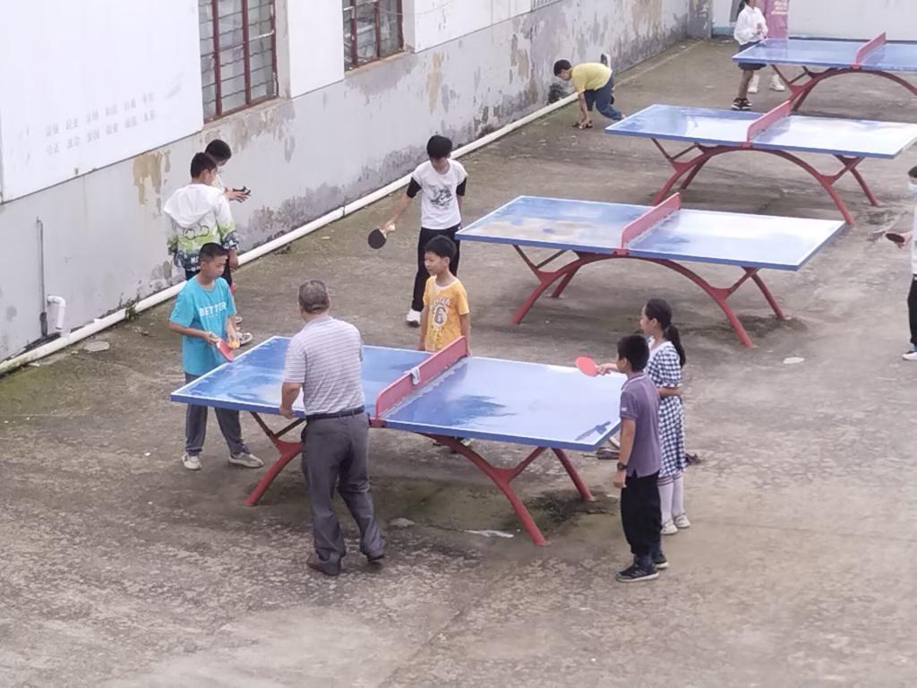 志愿者带领孩子们来到操场进行运动的选择以及学习。例如,选择乒乓球的员工拿着球拍在乒乓球桌边学习握拍姿势和传球动作,分组练习乒乓球单打技能。过程中志愿者们也认真观察,帮助纠正不到位的动作。