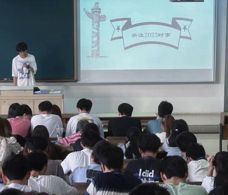 活动伊始,同学们集体观看了视频《你好,新时代的中国共青团》,此后聆听了习近平总书记在庆祝中国共产主义青年团成立100周年大会中的相关讲话。紧接着,同学们跟随着主持人的讲解一同回顾2023年的重大时事动态。其中,从我国疫情防控政策的重大调整中,同学们认识到奉献团结的重要性;从改革开放45周年这一重要节点中,同学们领悟到创新开放的深刻含义;从十年来“一带一路”的发展历程中,同学们体会到合作共赢的精神所在。