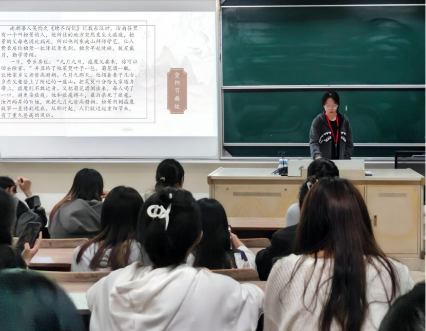 活动伊始,同学们在主持人的介绍下,了解到重阳节源自天象崇拜,起始于上古并普及于西汉,有着悠久的起源和发展史,并且在不同地区的发展中衍生出与当地特有传统文化相辅相成的民俗活动。