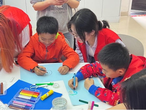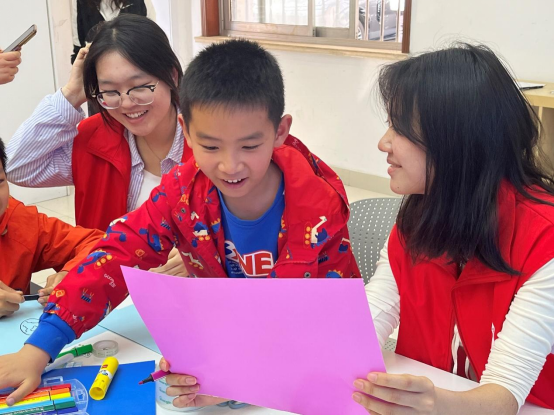 在回收图书后,志愿者们带领小朋友们开始了旧物改造活动。志愿者们为大家分发卡纸、画笔等手工物品,与小朋友们一一组队,共同实现对旧物实现二次创作。小朋友们发挥想象力,在志愿者的协助下大胆地进行创新改造,将环保理念体现到折叠的纸板和勾勒的图案上。桌子上摆放着一件件小卡片、小模型等别出心裁的作品,体现小朋友们争当绿色天使的心意之切。