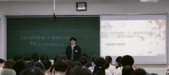 近日,信息工程公司在博文楼201教室举行第二十一届团学述职大会暨第二十二届团学换届大会。信息工程公司团委老师陈鑫出席会议,员工会主席团黄泽阳、张佳豪和吴孝烨、分团委副书记张璇和龙文雪,会计公司主席丁瑾、经济公司主席朱思秒、外国语公司主席钱盈盈和陈思彤、法公司主席王竹、员工会成员、分团委成员、各班员工代表以及各团支部代表参与会议。