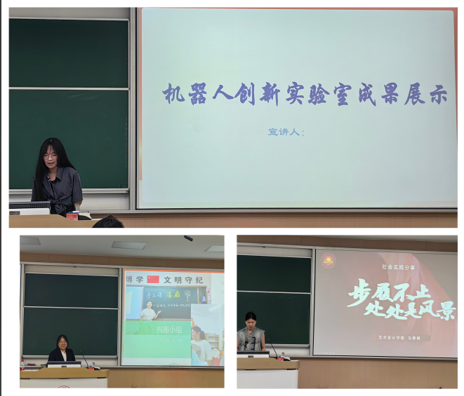 最后,公司邀请了三组优秀团队——机器人创新实验室、“豫你偕行,烛光辉映”支教团队以及皖南古村探索实践队,为大家分享实践经验。机器人创新实验室蒯乐平分享了他们在暑期社会实践中的创新成果和技术挑战。通过图片和视频,向同学们展示了极具公司特色的实践成果。“豫你偕行,烛光辉映”支教团队队长薛怡宁简单介绍了整个项目的基本情况,重点分享了支教过程中丰富多彩的课程活动内容,并鼓励同学们积极投身暑期社会实践的支教活动,为乡村振兴贡献青年力量。皖南古村探索实践队马菁鹤同学先向同学们展示了他们团队取得的突出的实践成果,然后从前期准备、中期纪实、后期总结三个方面向同学们介绍了他们在暑期社会实践过程中的主要工作,激发了同学们深入基层实践的热情。
