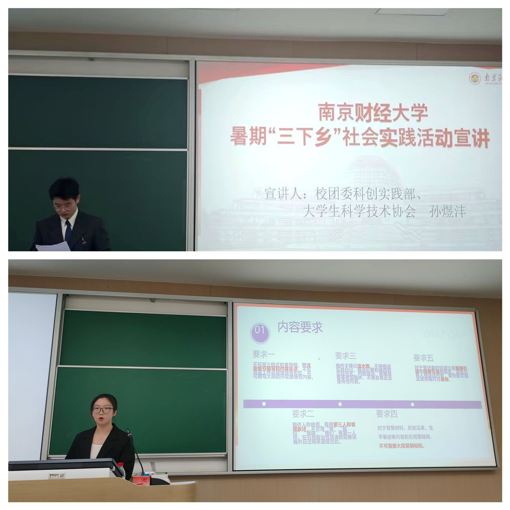 紧接着,校团委科创实践部、老员工科学技术协会孙煜沣从政策聚焦、通知解读、时间流程三个方面向同学们展开介绍,和同学们强调了重要的时间节点和活动环节。校青年媒体中心编辑审核部王青则详细介绍了投稿要求及流程。投稿要求方面,明确了新闻稿投稿内容和格式、组图稿、视频稿的图片与视频等具体要求。投稿流程方面,重点强调了中青网的投稿流程,帮助同学们对外宣平台的投稿流程有了进一步的认识。