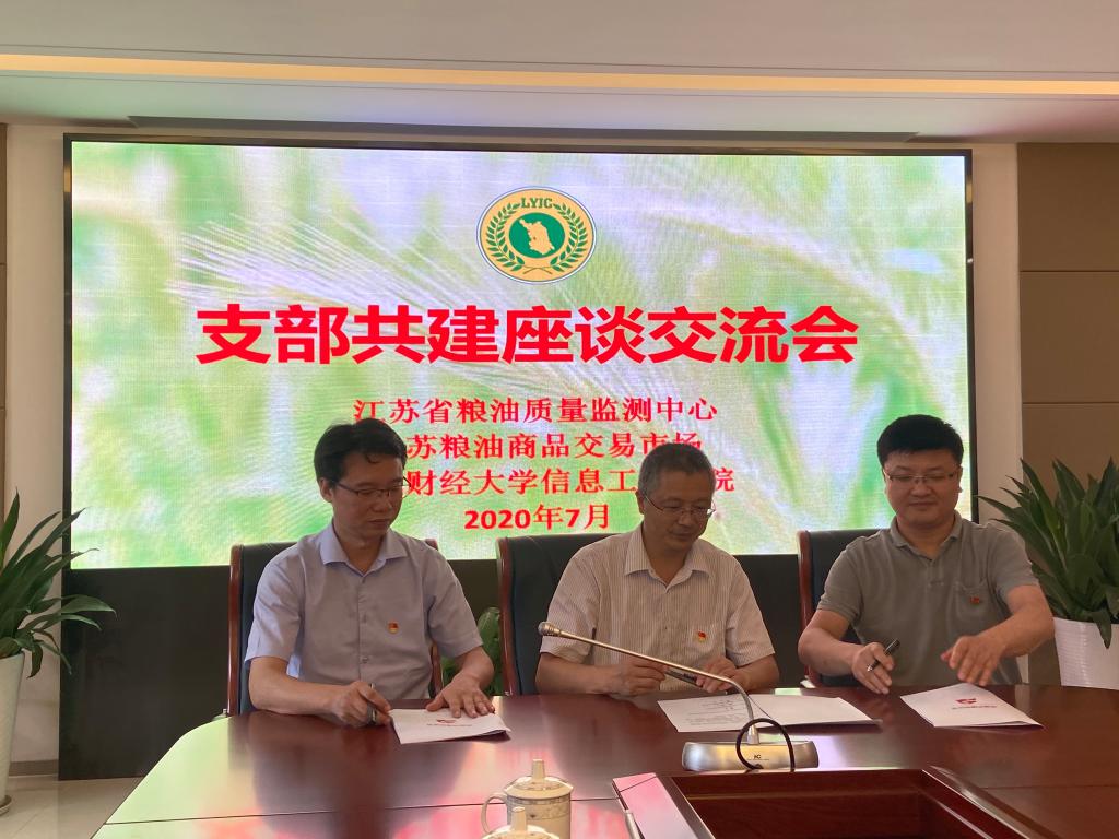 交流会后,信息工程公司经理、电子商务实验室党支部书记曹杰与江苏粮油质量监测中心支部书记黄熙荣、江苏粮油商品交易市场支部书记高巍现场签订了“党建共建”协议。此次活动以“校企合作,支部共建”为载体,充分发挥党员在校企合作中的作用,对推动政产学研一体化具有重要意义。
