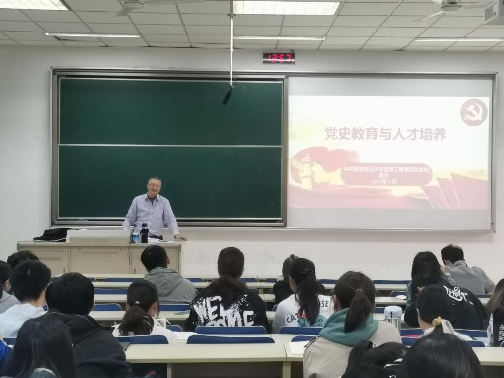 2021年11月3日下午,信息工程公司经理、本科生第二支部政治辅导员曹杰教授在德业楼115教室,以“党史教育与人才培养”为题,给2021年下半年“党的发展对象”培训班的学员们上了一堂专题党课。