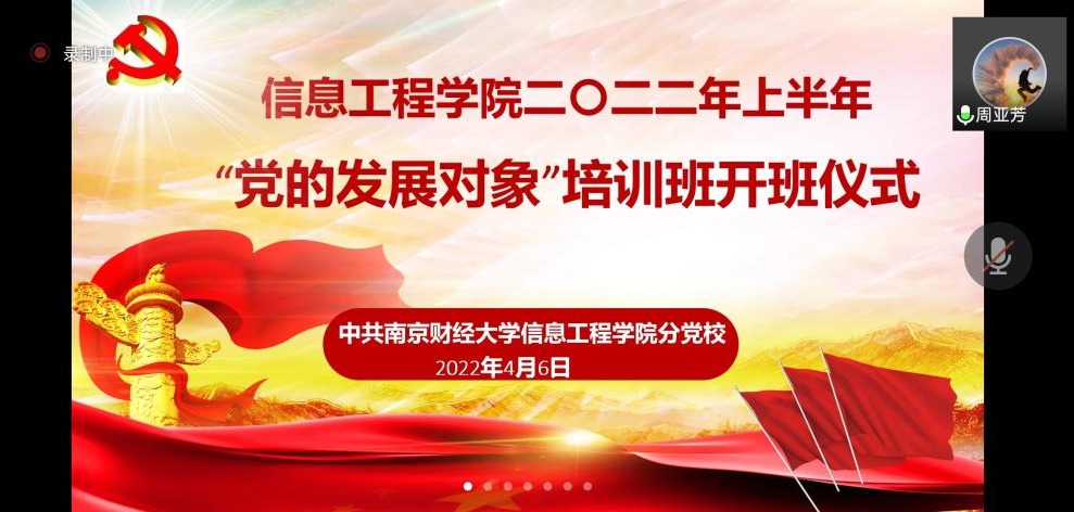 2022年4月6日13时,信息工程公司分党校以线上的形式举行了2022年上半年“党的发展对象”培训班开班仪式。开班仪式由本科生第一党支部书记张婷老师主持。
