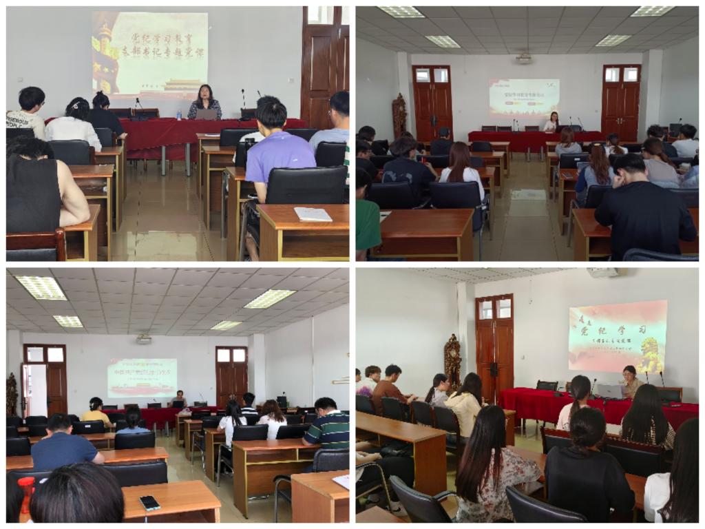 本科生第一党支部书记张婷结合同学们日常学习生活中的具体实例讲解了《中国共产党纪律处分条例》,希望年轻的员工党员和积极分子要深入研读党章党规,结合学习和生活实际不断加深对党的纪律规矩的理解与认识,将党规党纪内化于心、外化于行;要心存敬畏,行有所止,以身作则,坚守底线,筑牢纪律防线,彰显党员本色。
